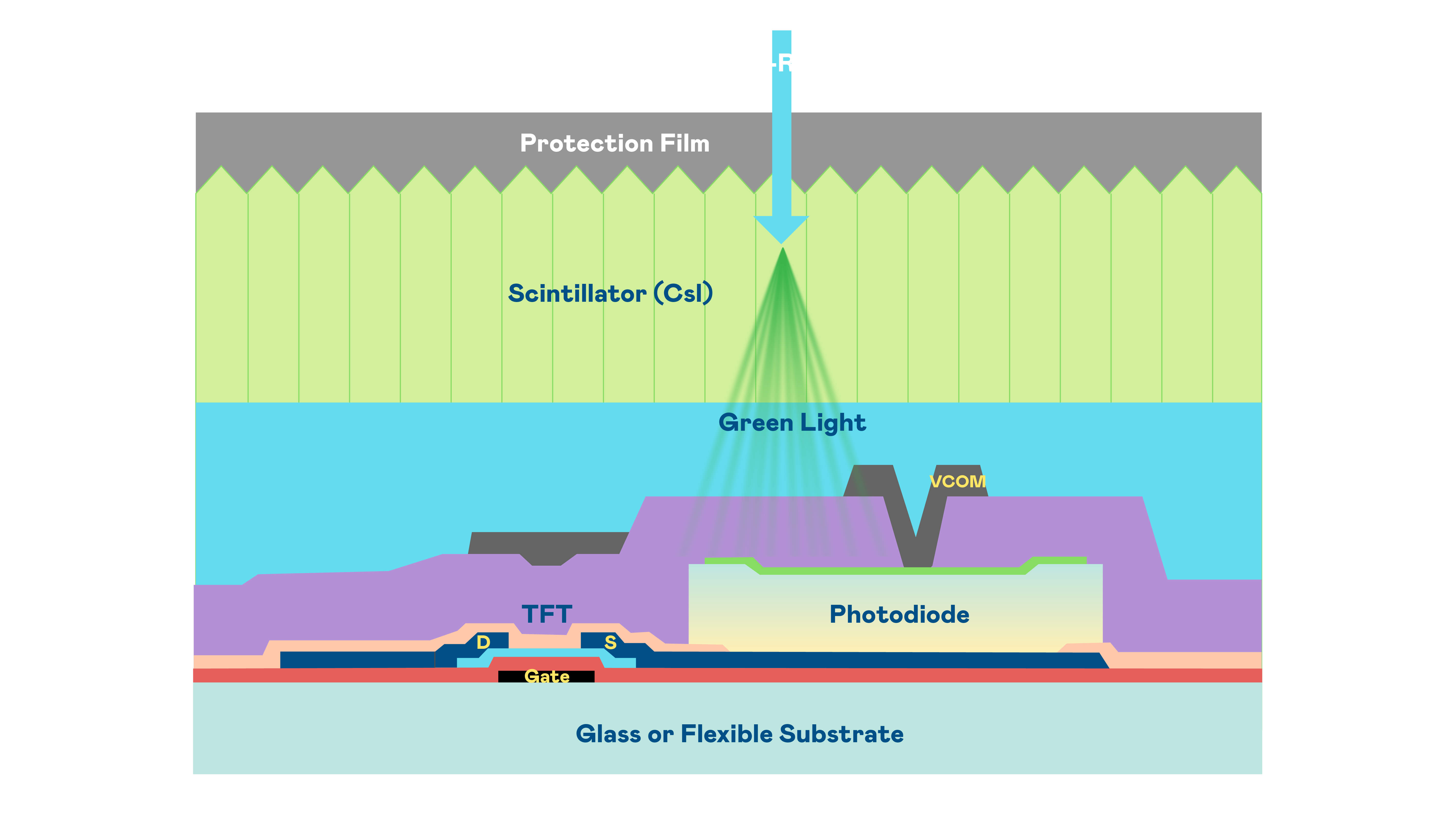 尊龙凯时Ag的X光影像感测阵列使用薄膜电晶体 (TFT) 作为每个像素的读取开关,搭配光电二极体(Photodiode)的光电转换元件,用以感测X光影像讯号。